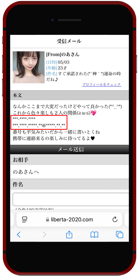 LIBERTA(liberta-2020.com)では、電話番号、メールアドレス、LINE IDなどの連絡先は全て文字化け(******)します。待ち合わせをしようとしても、待ち合わせ場所も文字化けして会えません。